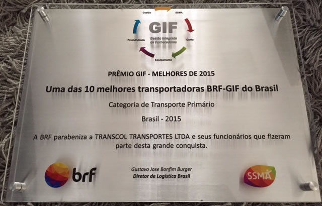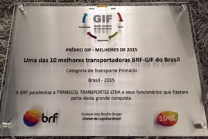 A Transcol foi premiada pela BRF como uma das 10 melhores transportadoras do Brasil. A BRF avaliou além dos pilares Processos e Resultados, critérios como boas práticas em saúde, segurança, e meio ambiente, para apresentar ao mercado quem são as empresas que mais se destacam por seus trabalhos e iniciativas quanto aos marcadores apontados.