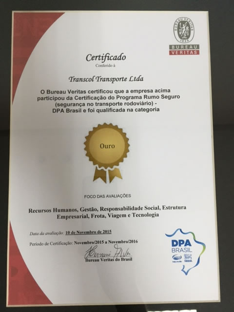 A Bureau Veritas do Brasil conferiu a Transcol a categoria OURO em novembro de 2015. A mesma é responsável por certificar empresas através do programa Rumo Seguro DPA Brasil, onde os focos da avaliação são: Recursos Humanos, Gestão, Responsabilidade Social, Estrutura Empresarial, Frota, Viagem e Tecnologia.