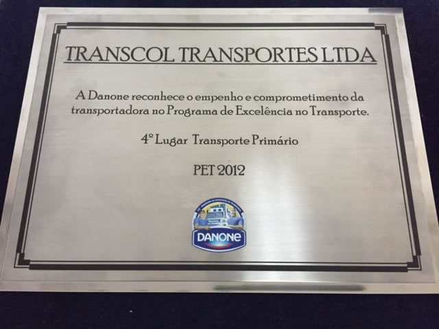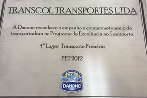 A Danone premiou a Transcol com troféu do programa Excelência no Transporte, que abrange a nível nacional vários itens além do empenho e comprometimento da transportadora.